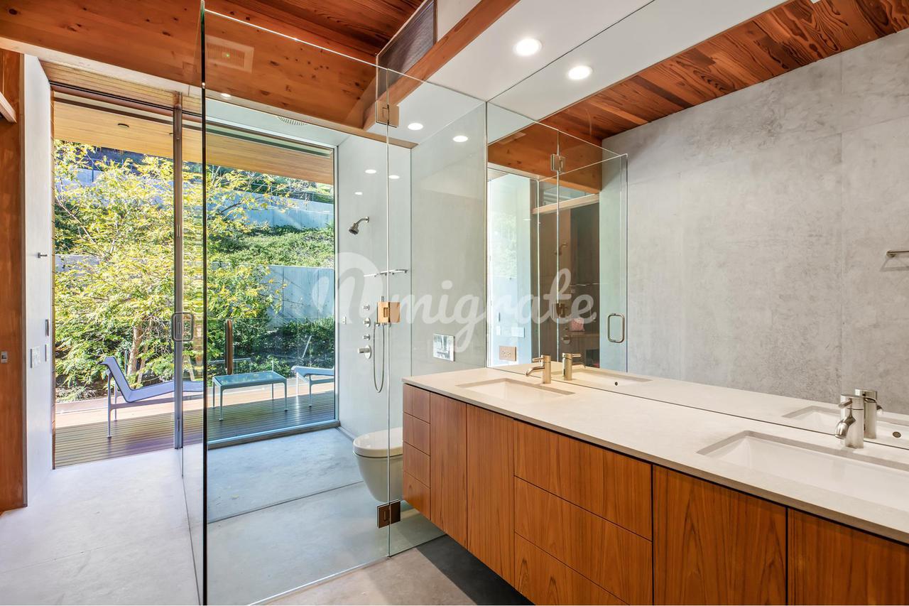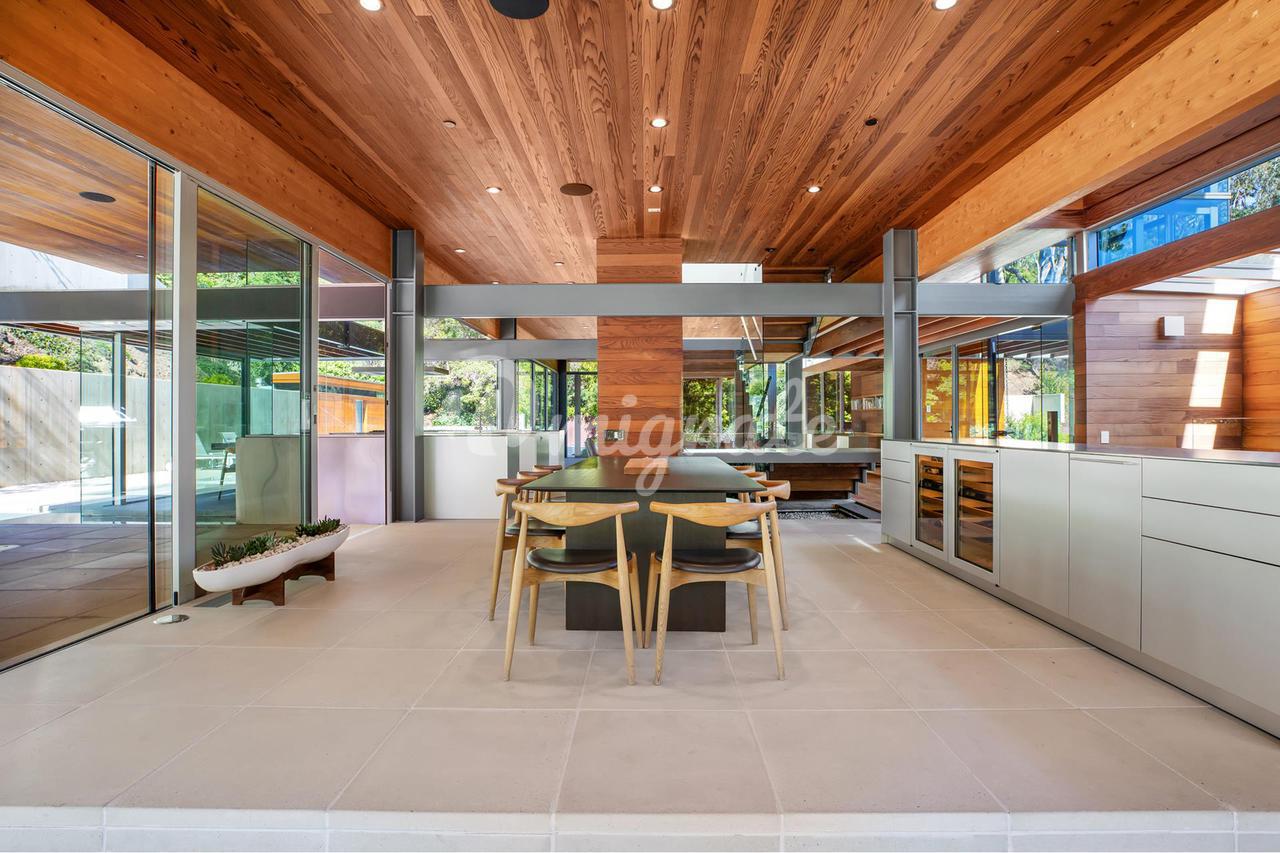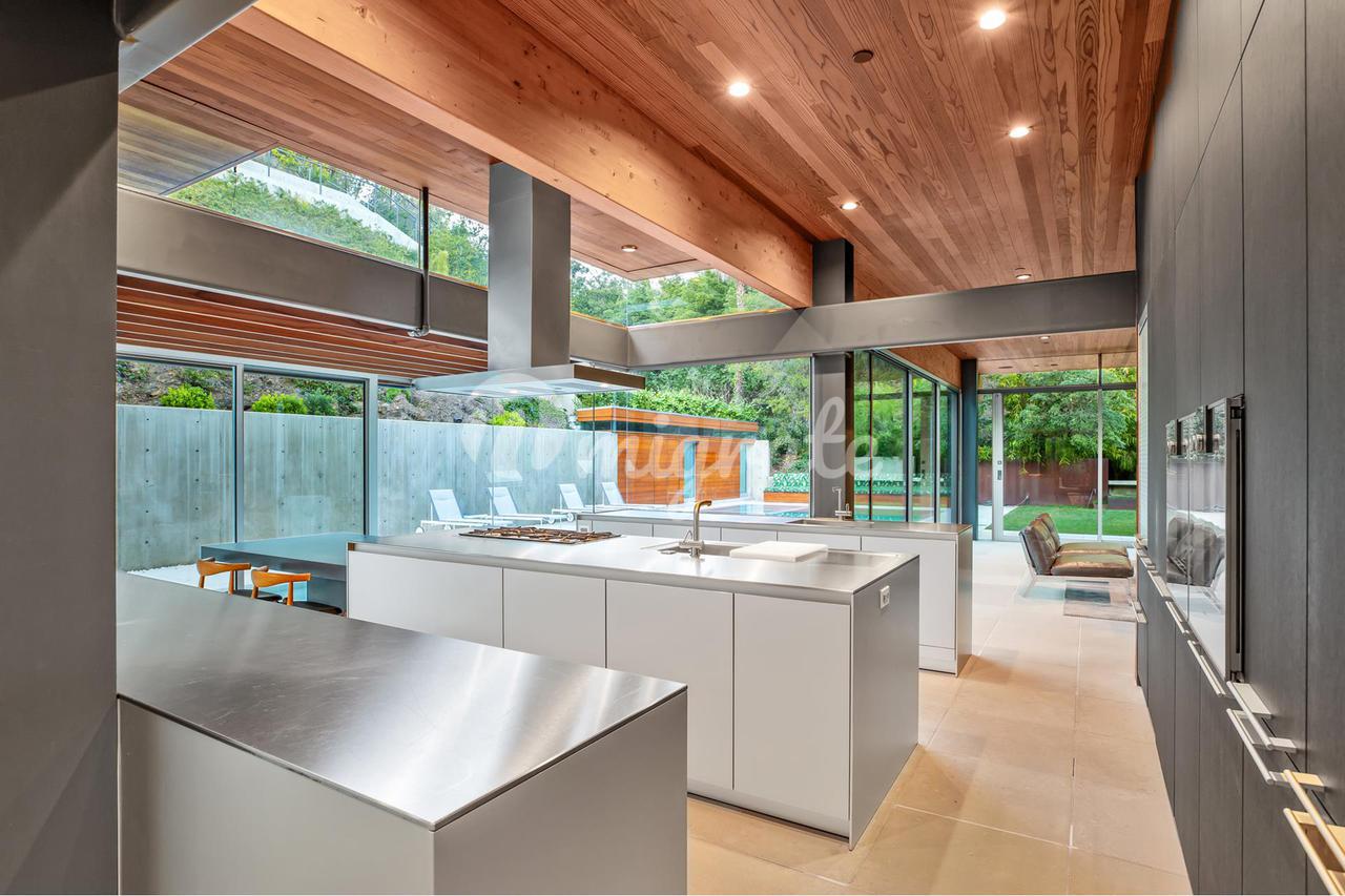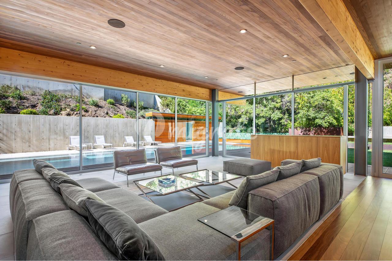 Вилла, спроектированная одним из самых великих калифорнийских архитекторов – Рейем Каппе, расположена на закрытой территории в Беверли-Хиллз. Вилла была построена в 2017 году и состоит из основного дома, гостевого дома и домика у бассейна. Основном дом включает гостиную, столовую, полностью оснащенную кухню, кабинет, кинотеатр, тренажерный зал и винный погреб.