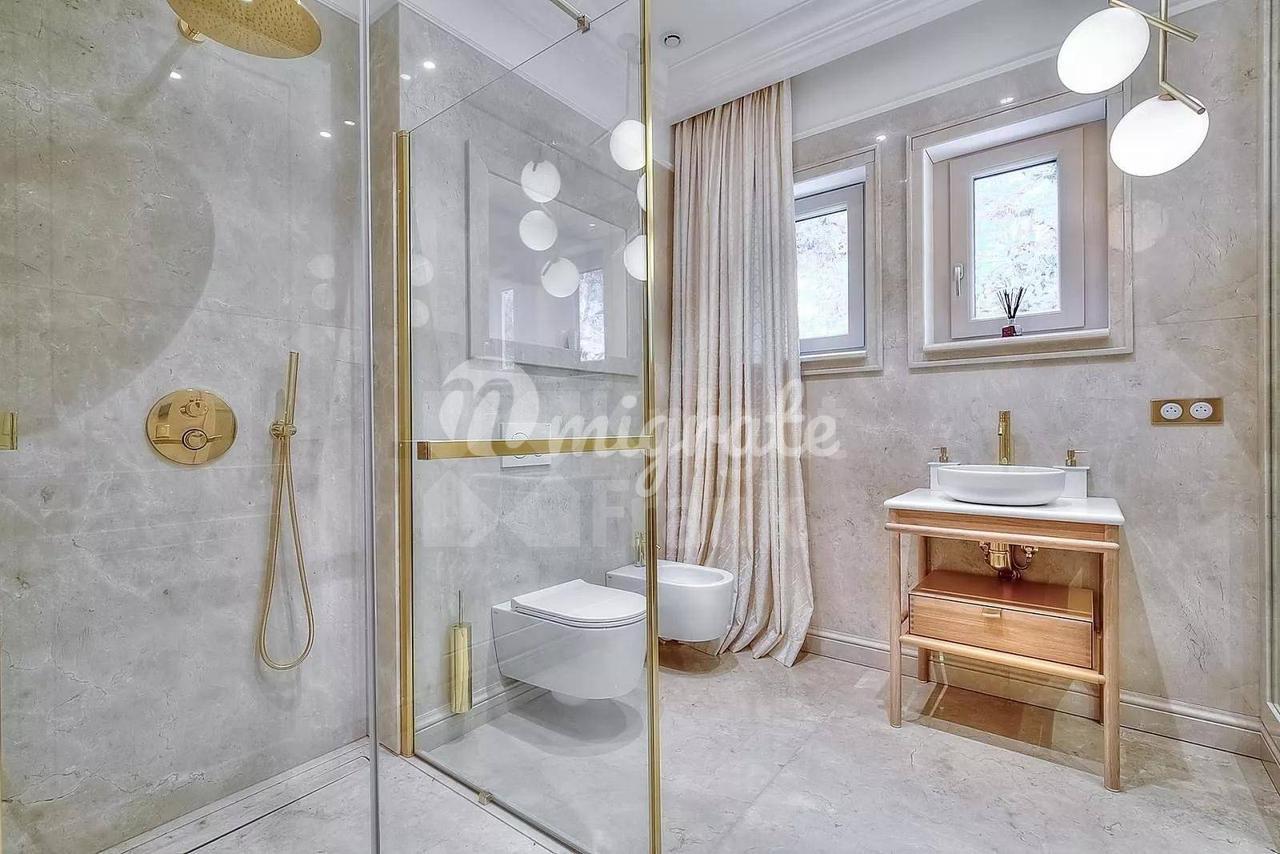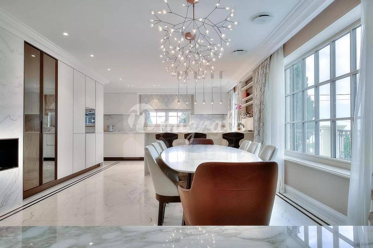 На первом этаже виллы расположена прихожая, красивая гостиная в мягких тонах, мраморная кухня с барной стойкой и большим обеденным столом, а также 3 спальни с ванными комнатами.