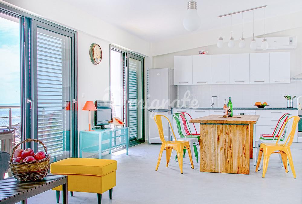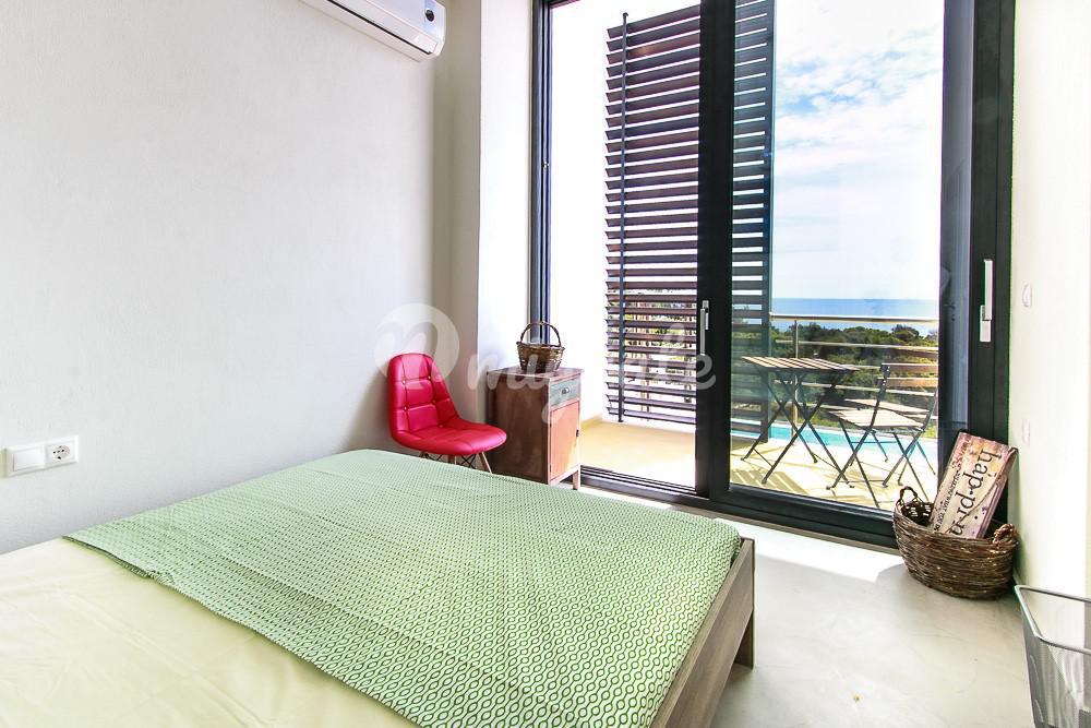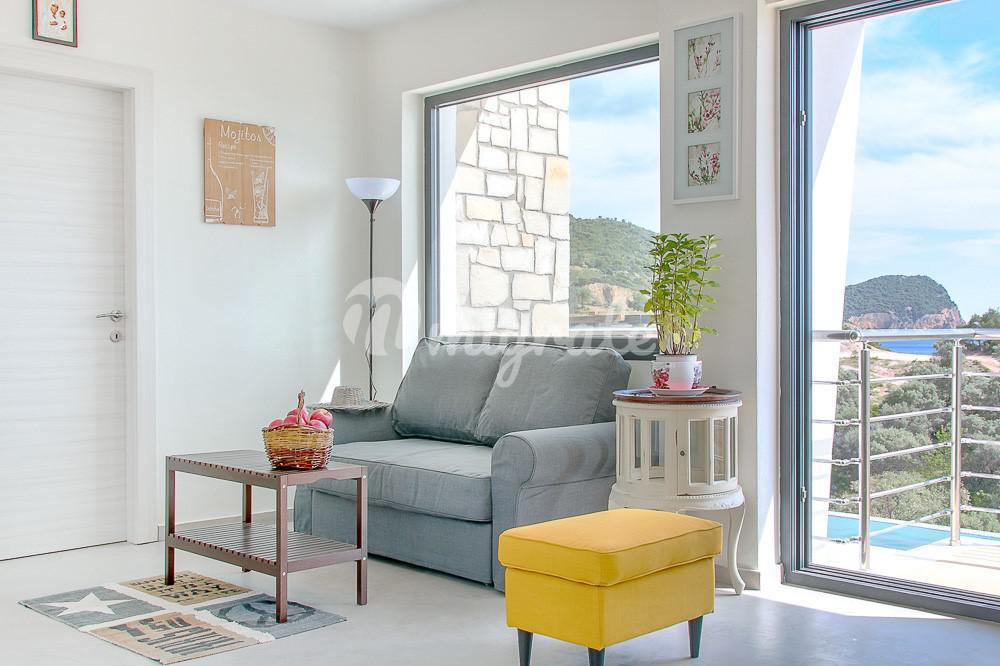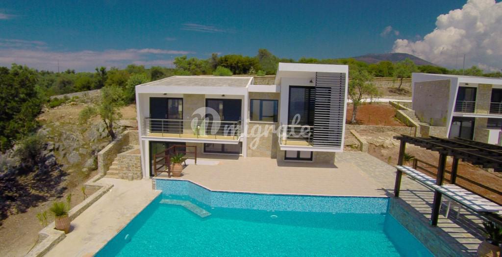 Двухуровневая вилла расположена в комплексе из шести вилл. Первый этаж включает две спальни, ванную комнату и гараж, второй: спальню с отдельной ванной комнатой, гостиную и кухню открытой планировки с камином и обеденной зоной. С балконов открываются изумительные виды на море и гору Афон.