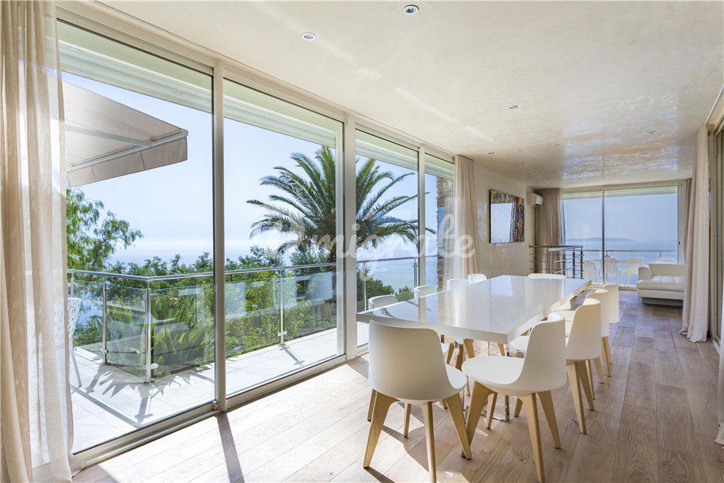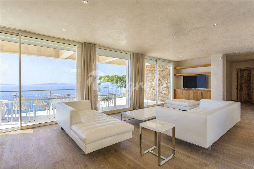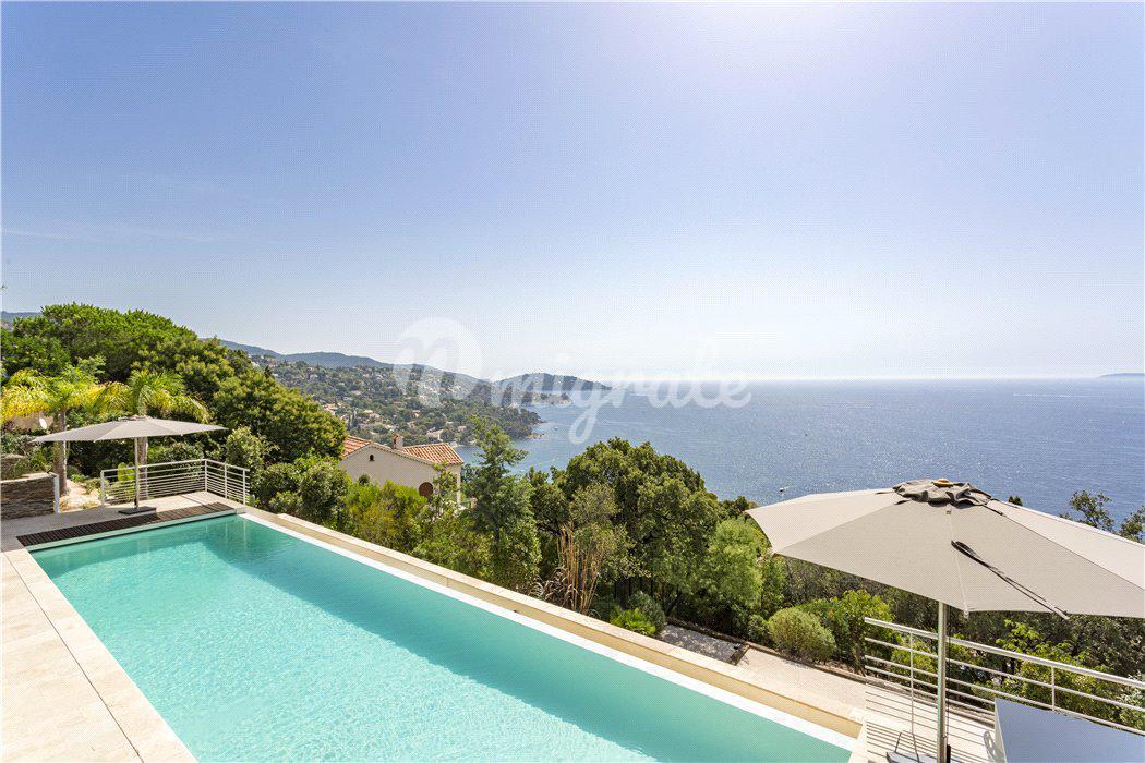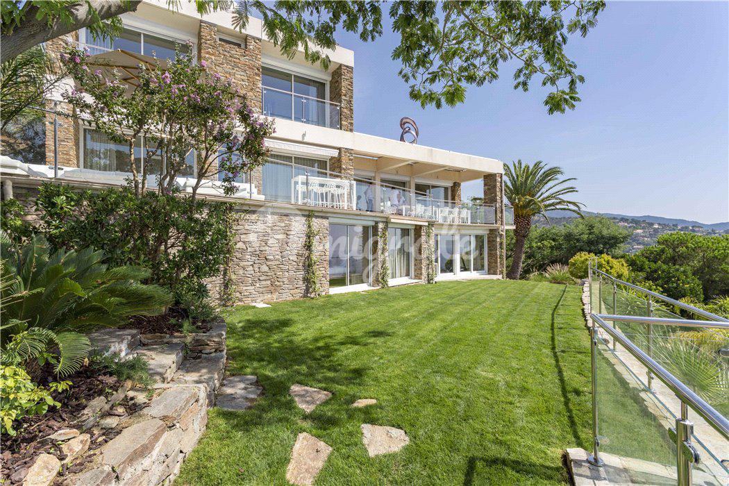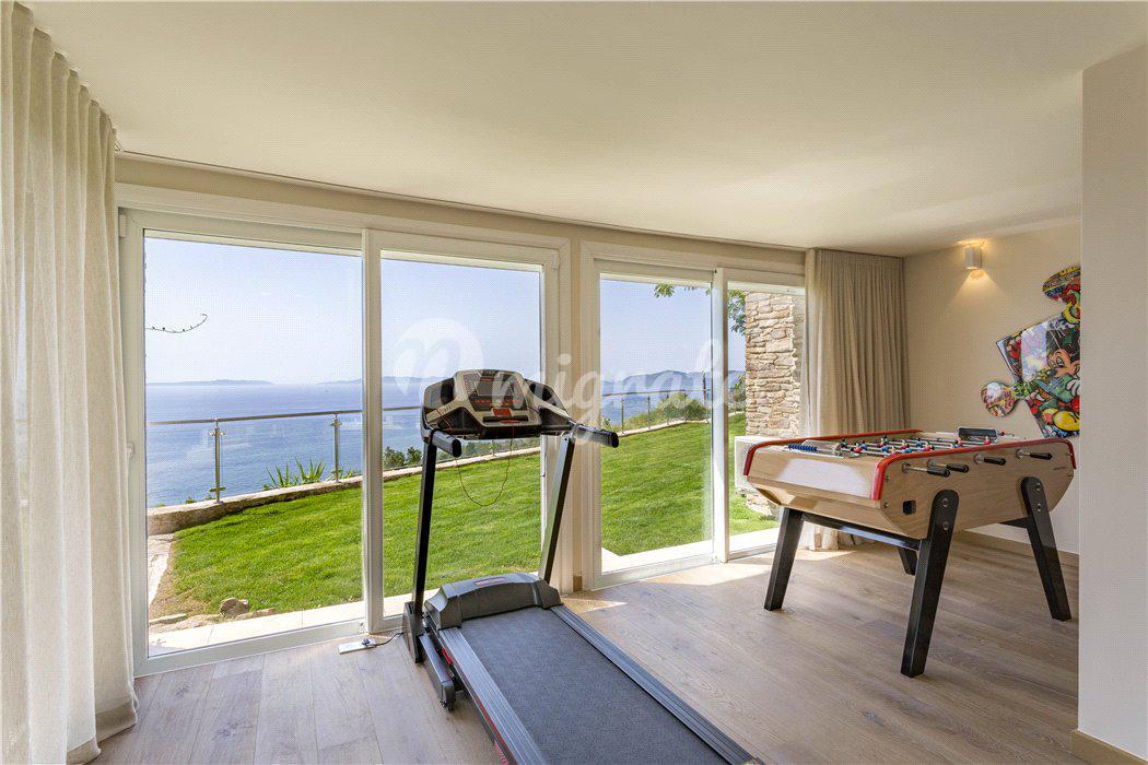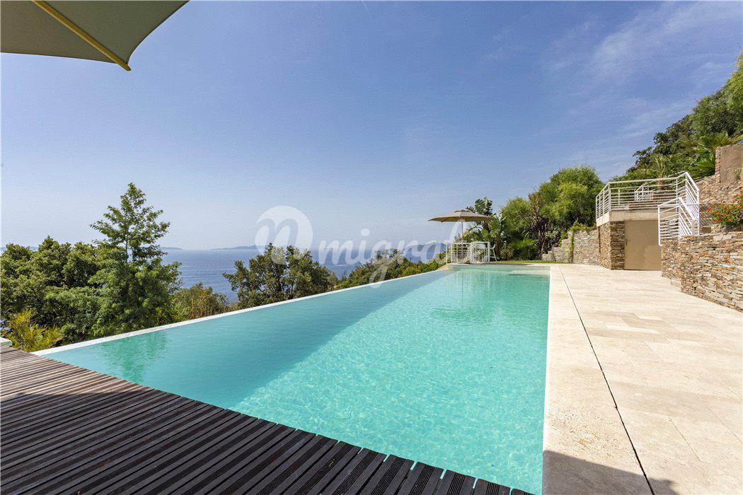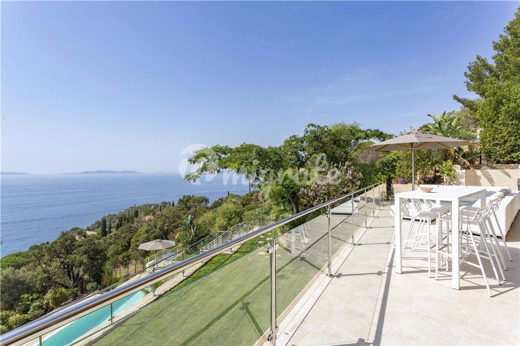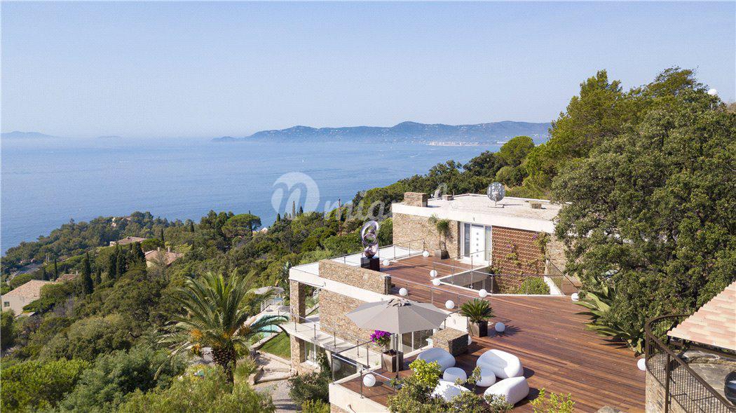 Вилла, отремонтированная в 2017 году, имеет великолепный панорамный вид (180 градусов) на французский остров Леван. Трехэтажная вилла, находящаяся на территории общей площадью 2200 кв.м, располагает различными выходами на обращенные к югу террасы, ведущие к «бесконечному» бассейну и полю для петанка через многолетние сады.