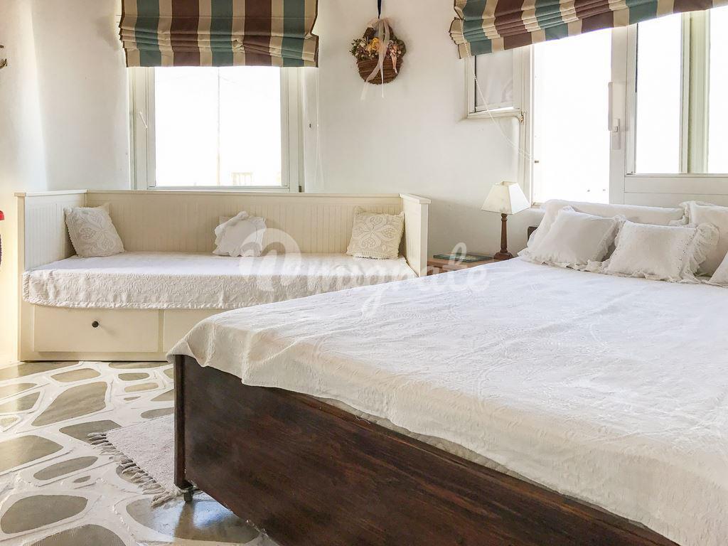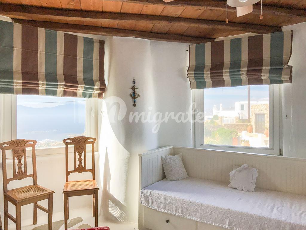 Вилла с панорамным видом на море расположена в районе Диакофтис, где находится множество магазинов, кондитерских, аптек и песчаный пляж со своими ресторанами, тавернами и кафе. Первый этаж включает полностью оснащенную кухню, ванную комнату и две застекленные веранды. Второй этаж включает три спальни. На участке есть обеденная зона и зона барбекю.
