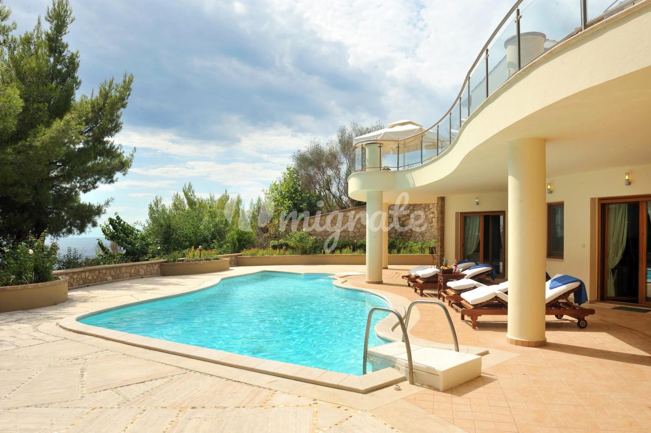 На участке расположена летняя кухня с зоной барбекю, терраса с видом на море, бассейн, крытая парковка.