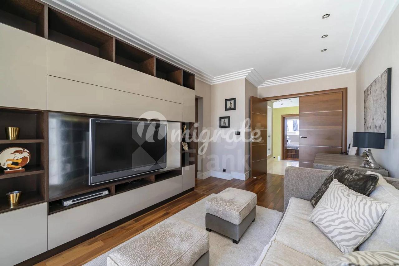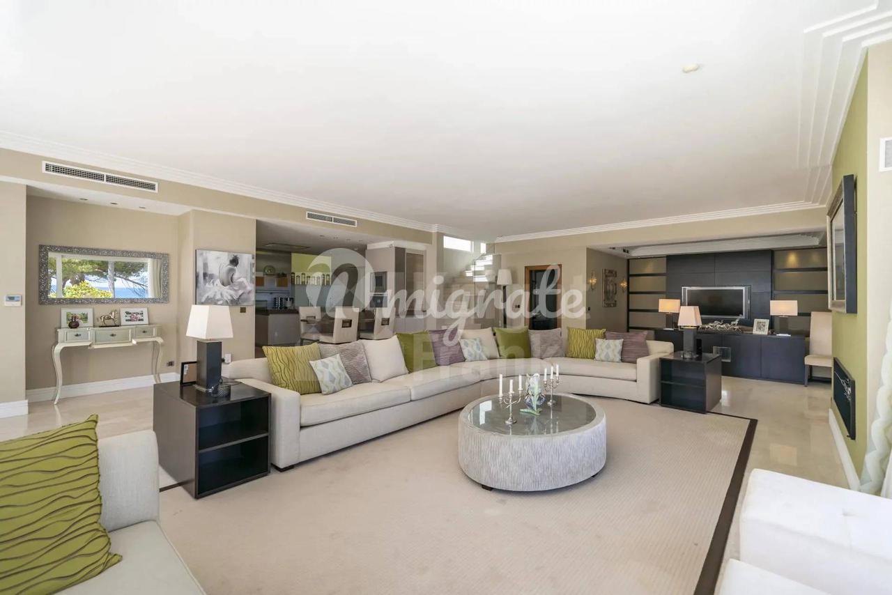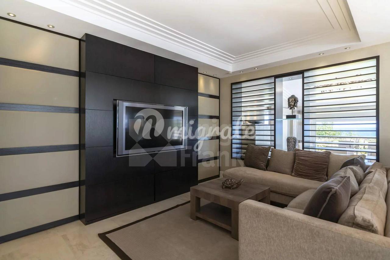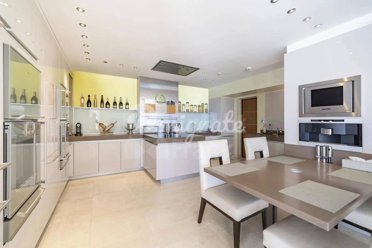 Вилла имеет жилую площадь 450 кв. м и располагается на трех уровнях. Первый уровень виллы состоит из холла, столовой, большой гостиной с видом на море и выходом в сад с эффектной дизайнерской кухней с меняющимся цветом освещения.
