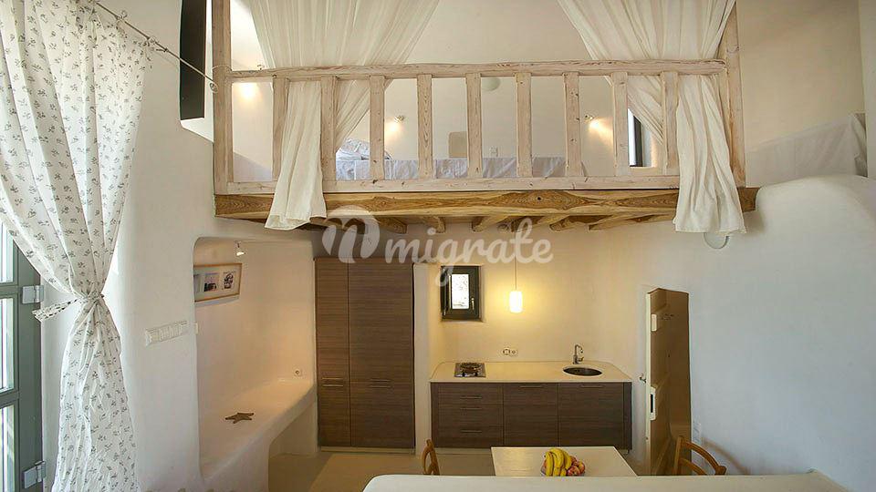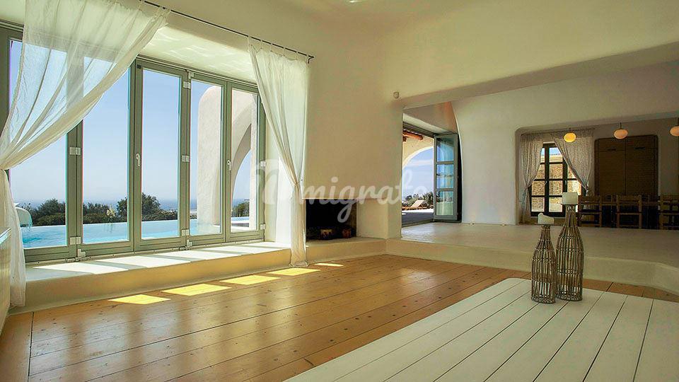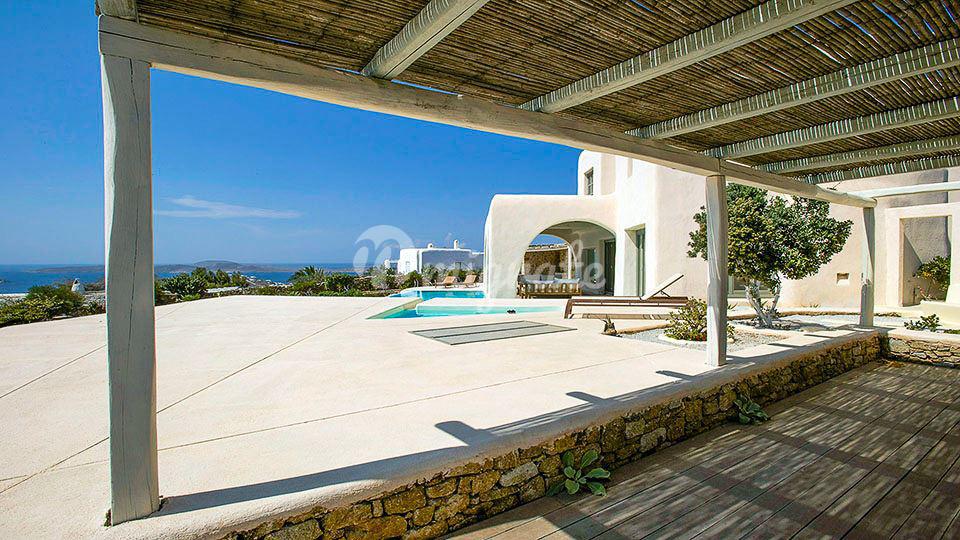 Вилла с захватывающими видами на море находится в одном из самых эксклюзивных районов Миконоса, в 10 минутах от города и аэропорта. Участок виллы, площадью 4 000 кв. м, включает основной дом и 3 гостевых домика. Основной дом включает три спальни и три ванные комнаты. Гостевые домики включают спальню и ванную комнату. В двух есть кухня и гостиная.