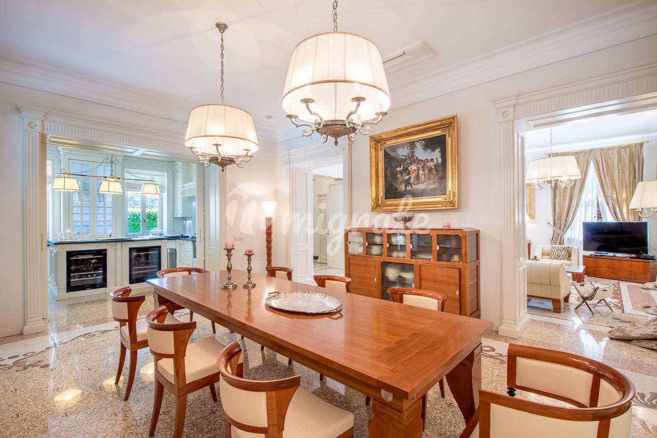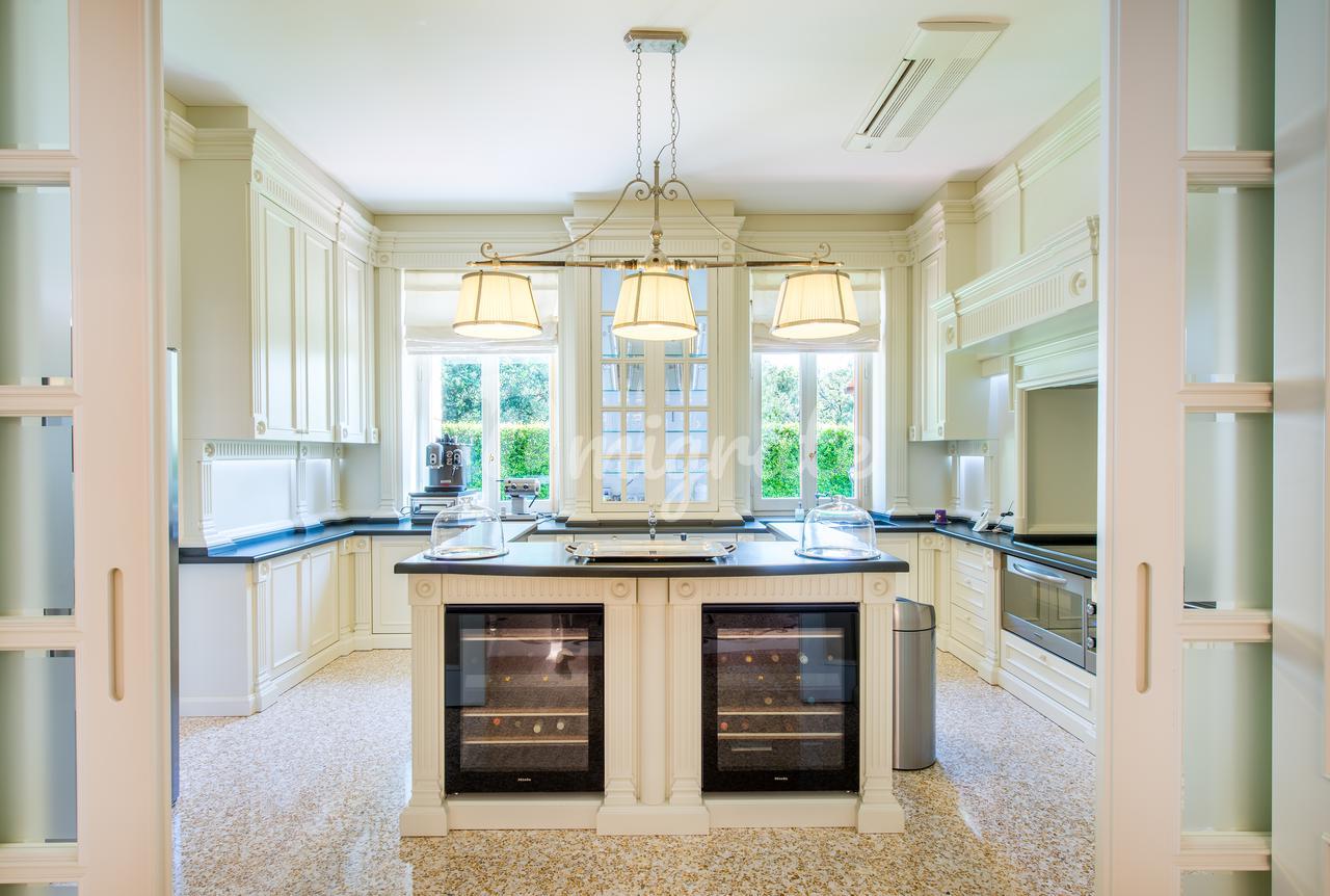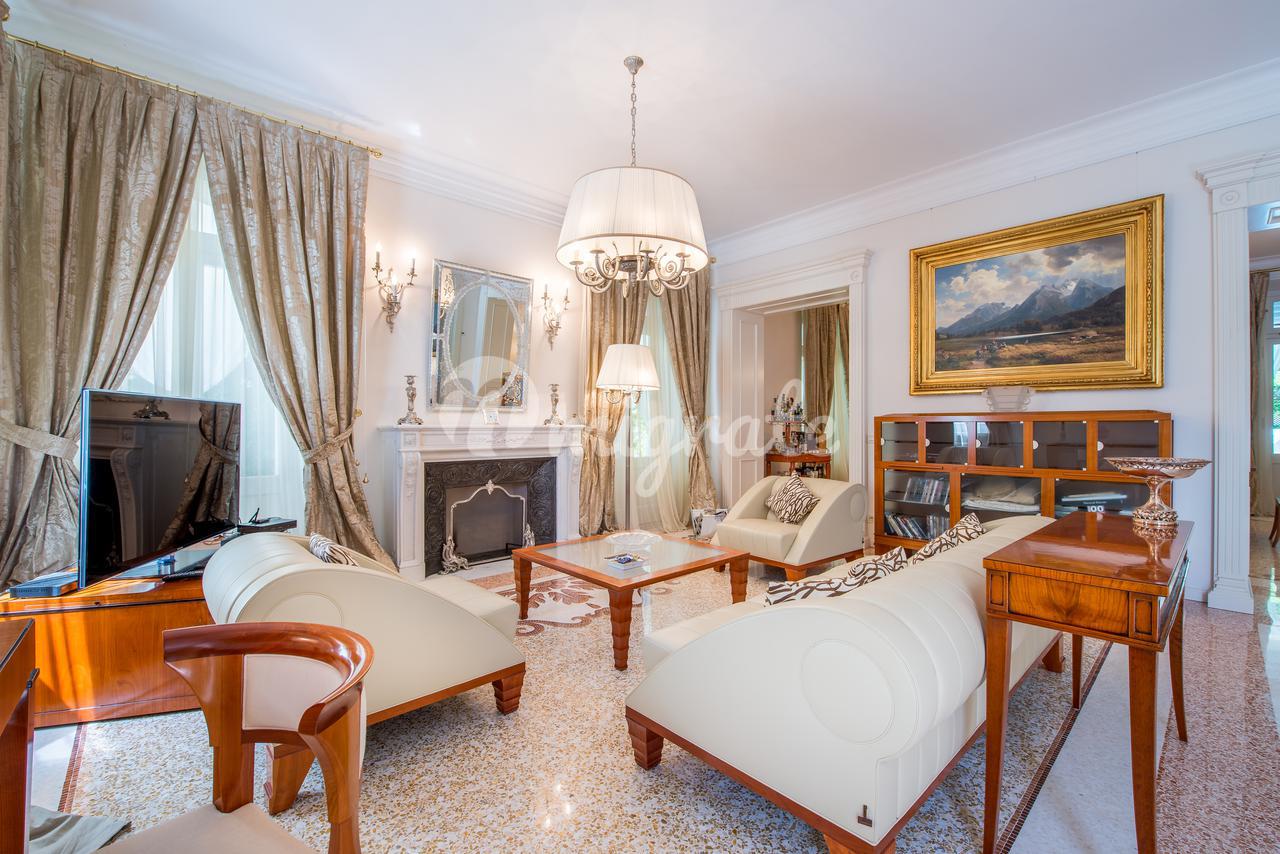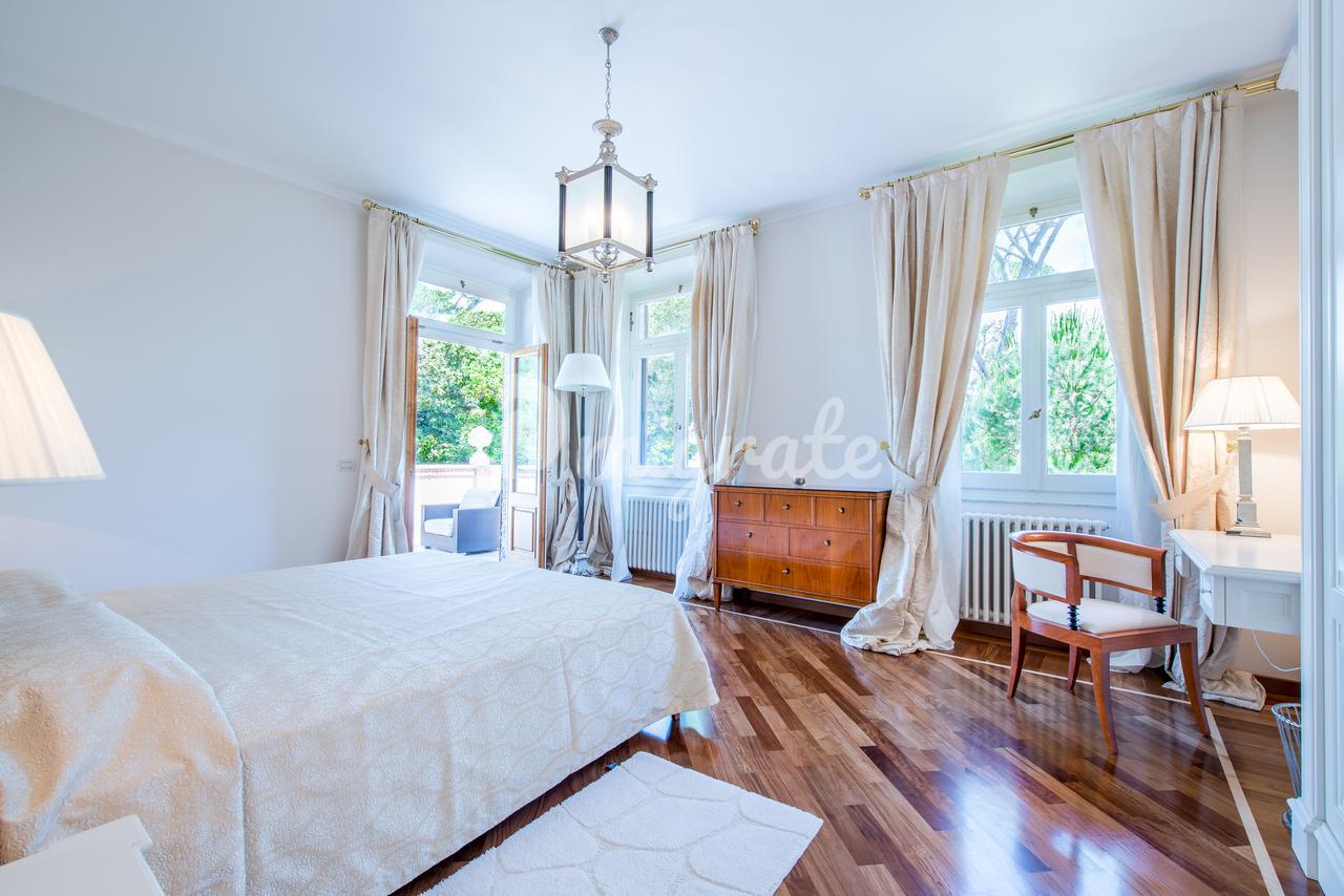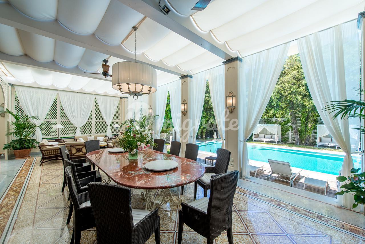 Роскошная вилла площадью 500 кв. м расположена в престижном районе Рома Империале в курортном городе Форте-дей-Марми, в 400 метрах от пляжа. Вилла была недавно отреставрирована с использованием самых высококачественных материалов, были сохранены исторический фасад и старинные элементы декора. Здание имеет три наземных этажа и цоколь, которое сегодня используется как прачечная. На первом этаже дома находятся просторная гостиная, столовая с выходом на террасу, гардеробная, гостевой санузел и спальня с собственной ванной комнатой. На втором этаже: мастер-спальня с собственной ванной комнатой, две просторные спальни с ванными комнатами, все спальни имеют выход на собственную террасу. На третьем этаже: спальня с ванной комнатой, домашний кинотеатр, еще одна спальня с ванной. На крыше дома обустроена зона отдыха с гидромассажной ванной, открывается великолепный вид на Апеннины. На придомовом участке в 3 100 кв. м, окруженном высокой изгородью из зеленого лавра, расположен большой бассейн с подогревом (15х6 м) и зоной гидромассажа. Интерьер виллы выполнен из качественных дорогих материалов: в отделке ванных комнат использован оникс, различные виды мрамора, в том числе один из самых ценных - желтый сиенский мрамор. Вся мебель выполнена на заказ лучшими мастерами Италии, пол выполнен в технике венецианской мозаики известной марки Fantini Mosaici.
