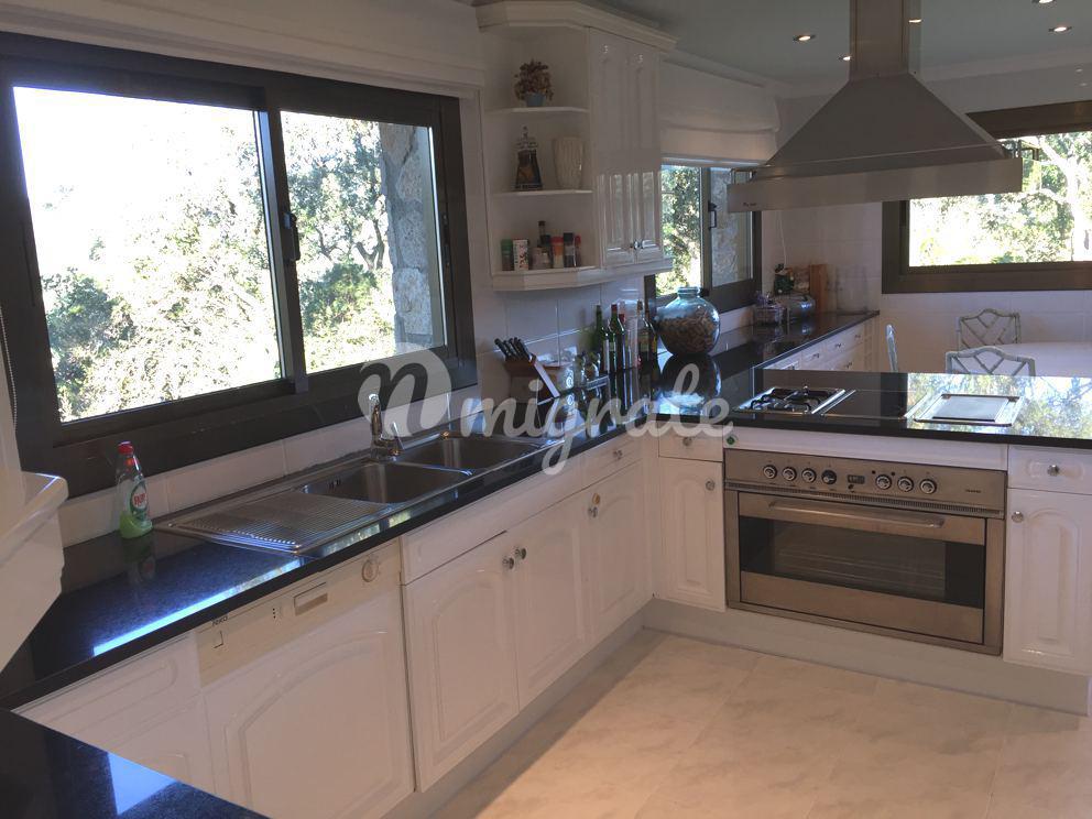 На участке площадью 7 090 кв. м находится основная трехэтажная вилла и дом площадью 70 кв. м с сауной, джакузи и комфортной зоной отдыха. Также на участке расположена зона барбекю, бассейн с подсветкой и разбиты ухоженные сады с фруктовыми деревьями. Участок окружен сосновым бором.