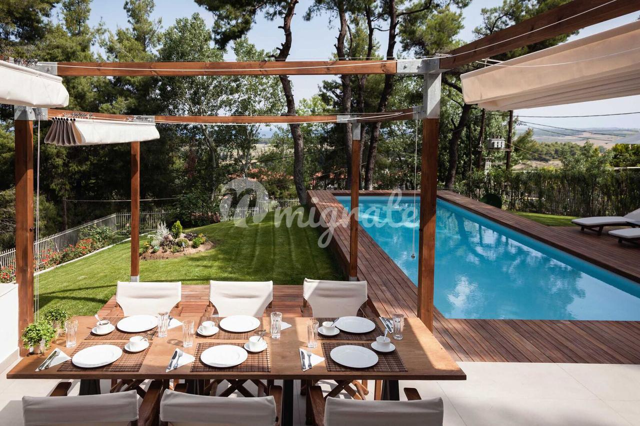 Современная вилла расположена в окружении сосновых лесов и оливковых рощ, в районе богемного курорта Сани, откуда открывается великолепная панорама на гору Олимп.