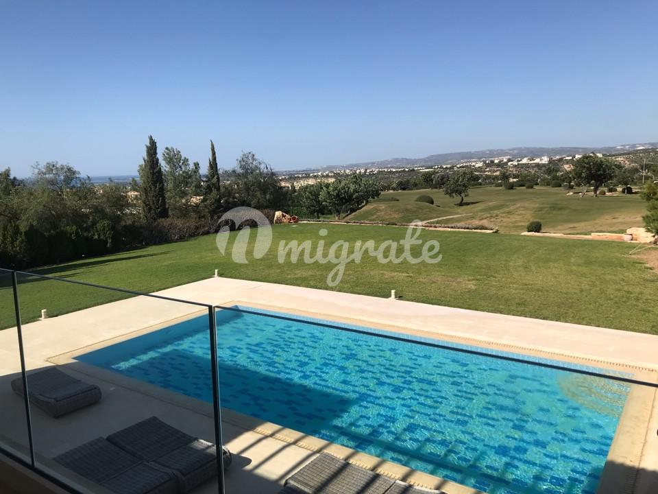 Двухэтажная вилла с частным бассейном расположена на роскошном закрытом гольф-курорте в Пафосе.
