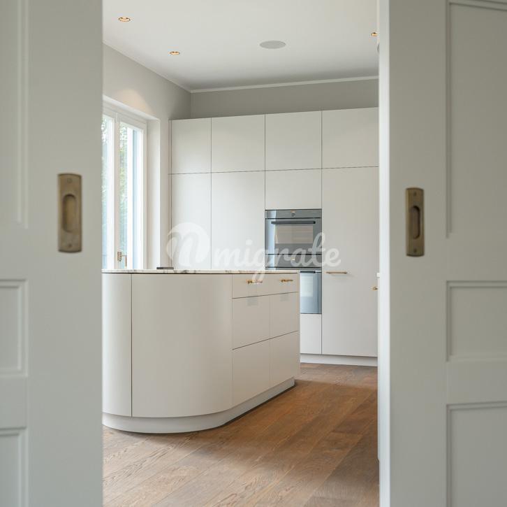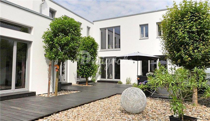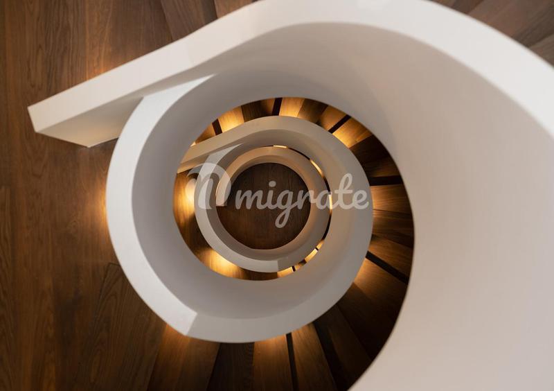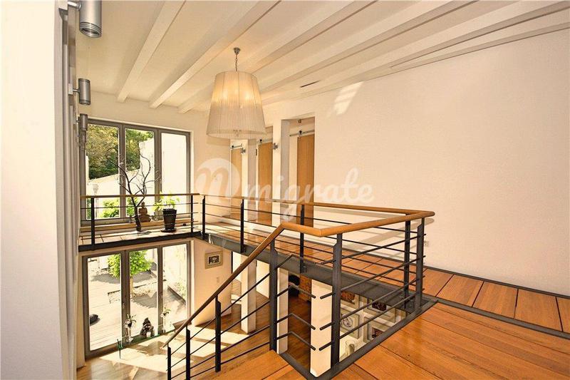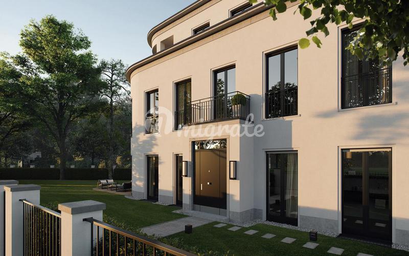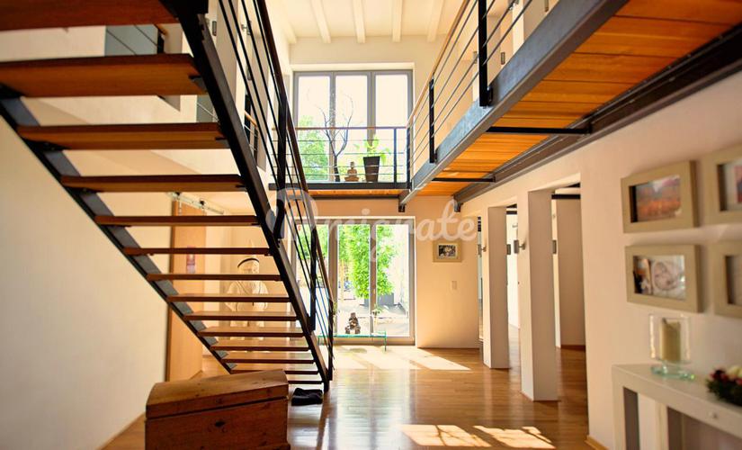 Вилла находится в популярном и престижном районе Грюневальд, в окружении частных домов и особняков. Центром виллы является просторный холл с футуристической лестницей, которая дополнена лифтом и соеди