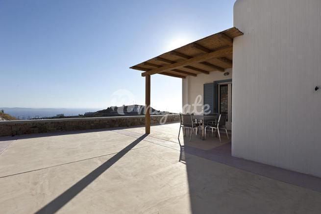 Новая вилла расположена на берегу моря, в 5 минутах езды до центра Миконоса. Вилла входит в жилой комплекс, состоящий из трех вилл, из которых она расположена на самом возвышенном участке. С виллы отк