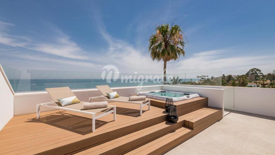 Строящаяся вилла с четырьмя спальнями и студией в комплексе из 38 объектов недвижимости на Новой Золотой Миле в Эстепоне, на первой линии от моря, с лучшими стандартами качества, с использованием веду