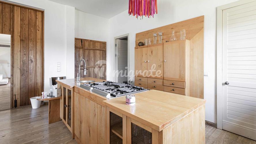 Ориентация солнца: юго-юго-запад Чистая жилая площадь 461 м2 плюс террасы распределены по трем этажам. Первый этаж: прихожая, большая гостиная-столовая, открытая американская кухня с кухней и островом