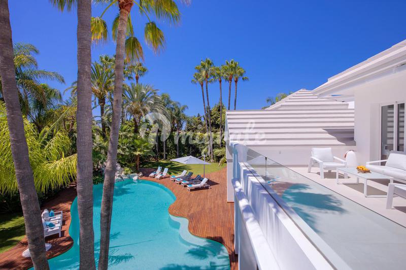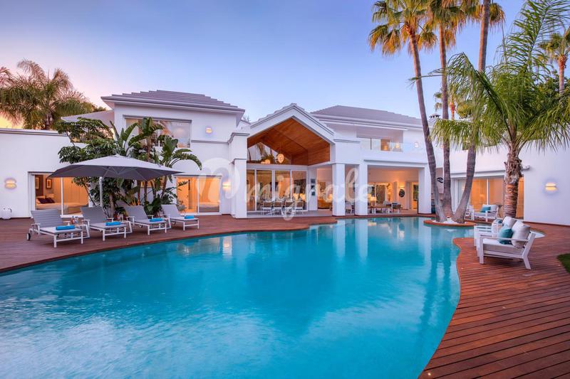 Роскошная 7-спальная вилла, перестроенная в соответствии с новейшими архитектурными тенденциями, расположена на первой линии на побережье (7 км от центра Марбельи). На территории разбит большой сад с