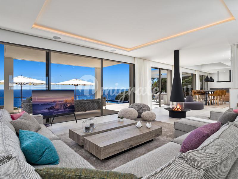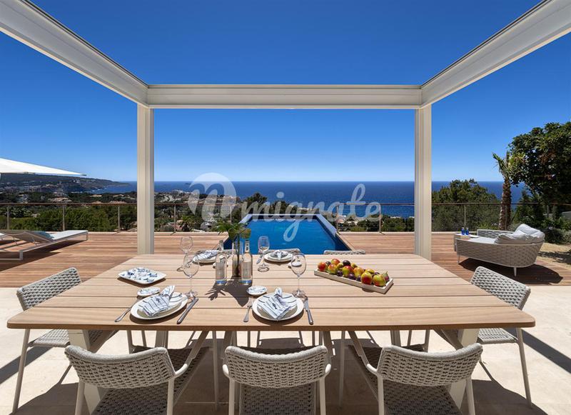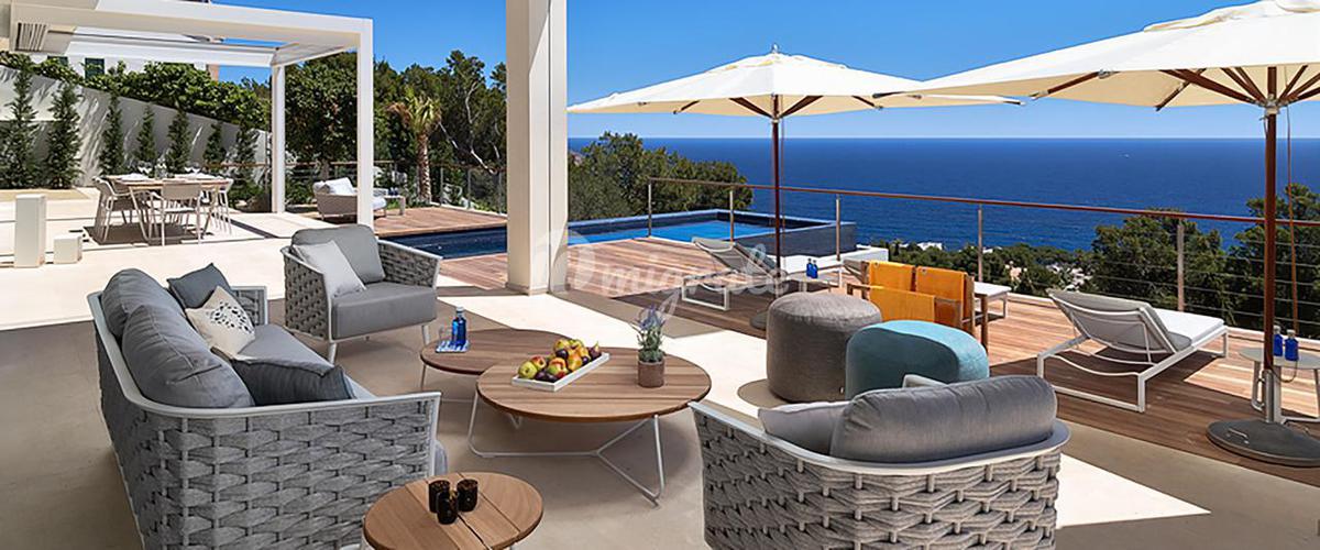 Современная вилла в средиземноморском стиле расположена на склоне холма в шаговой доступности от пляжа Эс-Фигераль. С виллы открывается потрясающий вид на море. Международный аэропорт находится всего