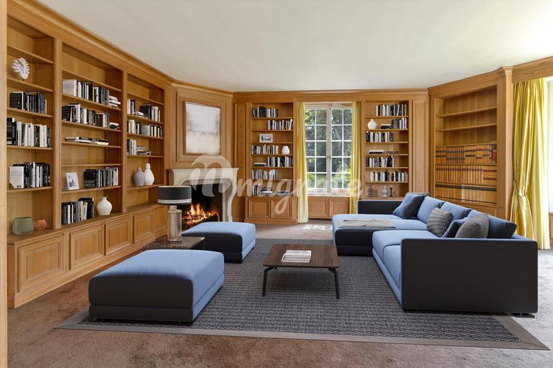 На первом этаже этого дома находится прихожая с гардеробной, 3 гостевых туалета, спальня и библиотека. В доме есть светлая большая гостиная с примыкающей столовой, оборудованная кухня и подсобное поме