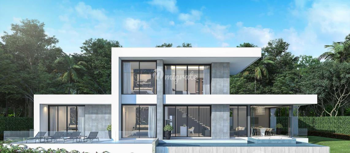 Двухэтажная вилла модерн дизайна с бассейном. Вилла с пятью спальнями и четырьмя ванными комнатами. Гостиная открытой планировки совмещена с кухней и столовой зоной. Панорамные окна от пола до потолка