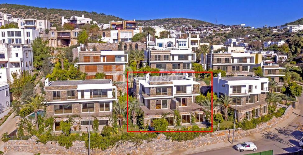 Отдельная трехэтажная вилла в Бодруме. Особенности: 4 спальни, 4 ванные комнаты, 1 туалет, 1 гостиная и кухня, частный бассейн, частная крытая автостоянка, частный задний и передний сад, терраса с пат