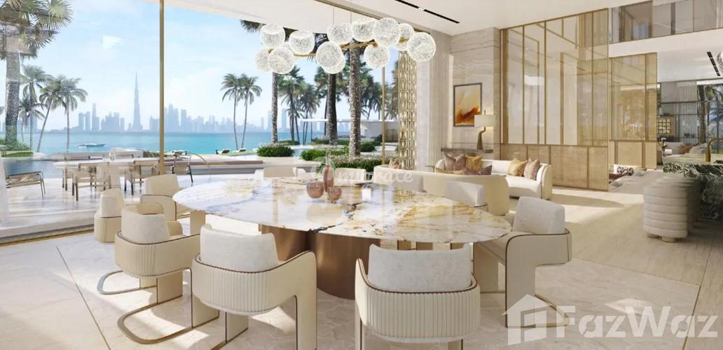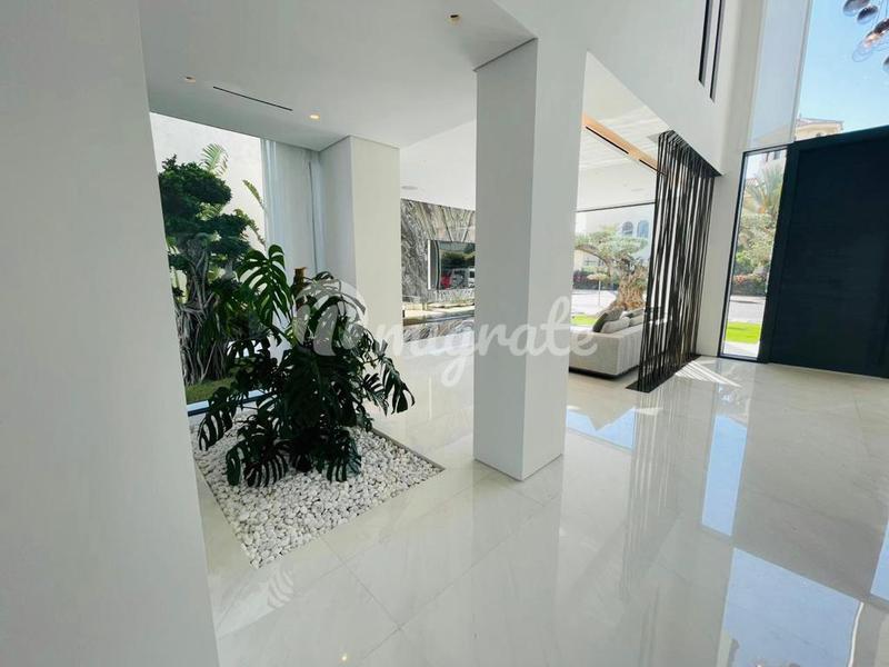 Современная 7-спальная вилла расположена на краю "ветви" I острова Пальма Джумейра. Из окон открываются потрясающие виды на марину Дубая, и отель Atlantis. На первом этаже находится просторная гостина