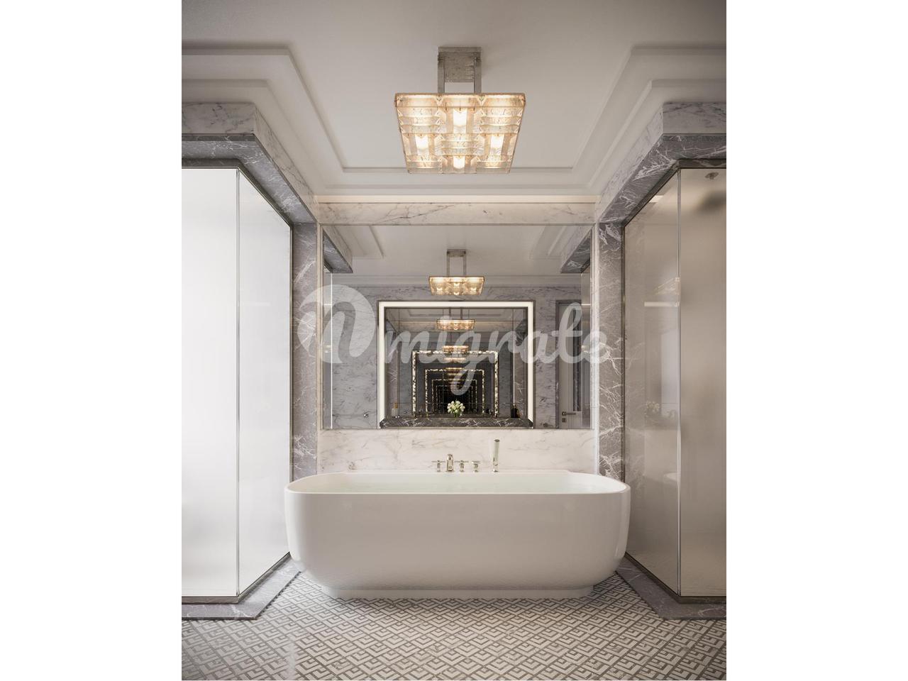 Дополнительная ванна оснащена специально разработанным настенным туалетным столиком с двумя выдвижными ящиками и столешницей из полированного мрамора, светильниками из полированного никеля и полом из полированной мраморной плитки. Ванная комната с душем и ванной от пола до потолка отделана плиткой из каррарского мрамора.
