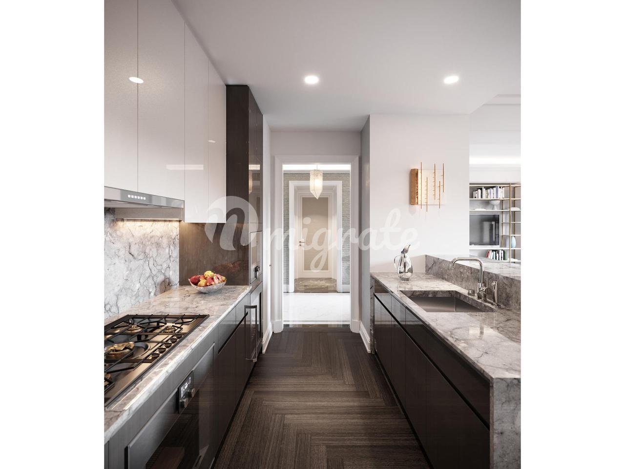 Открытая кухня образована полуостровом с барной стойкой высотой более 25 футов и основной гостиной зоной длиной более 25 футов, имеет просторные художественные стены и легко вмещает как обеденный стол на шесть персон, так и роскошную группу сидячих мест. Выполненные на заказ детали включают лепнину в виде бухты, массивные межкомнатные двери, карманы для драпировок и абажуров, а также 4-дюймовые полы из белого дуба в елочку.