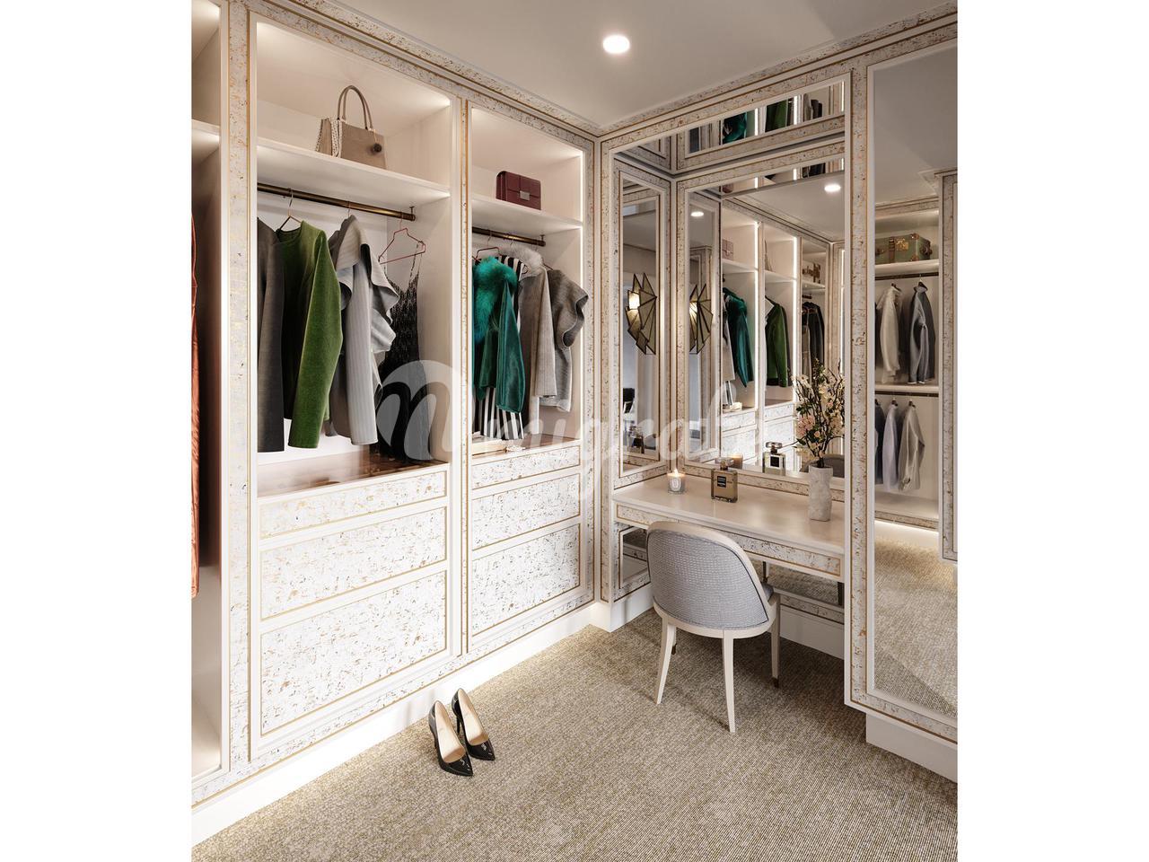 В главной спальне есть просторная гардеробная и ванная комната. Стены ванной комнаты от пола до потолка отделаны полированными плитами из белого мрамора Монблан, а пол выполнен из мозаичной мраморной плитки с подогревом, выполненной по индивидуальному заказу, в мотиве, вдохновленном Waldorf Astoria. Красивый туалетный столик, спроектированный Жаном-Луи Денио, изготовлен в Италии компанией Molteni&C с мраморной столешницей и полированным лаковым основанием. Туалетный столик и встроенная ванна с душем и мраморной окантовкой оснащены приспособлениями и деталями, изготовленными на заказ из полированного никеля специально для The Towers.