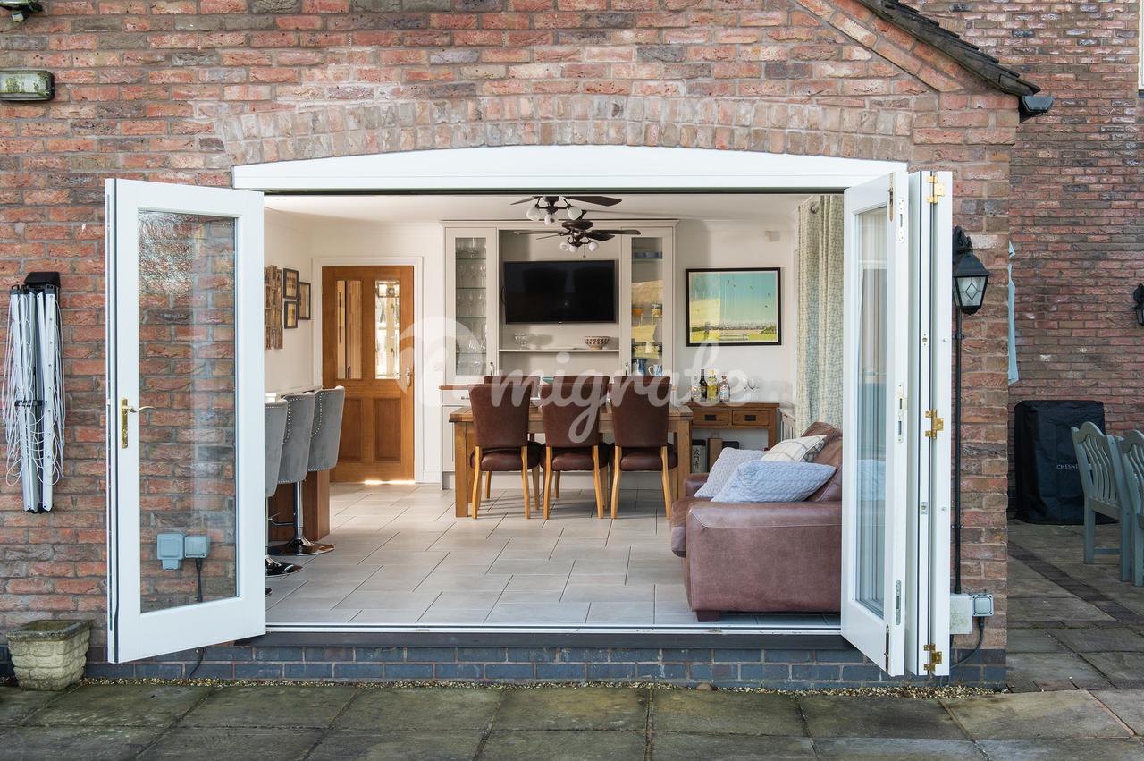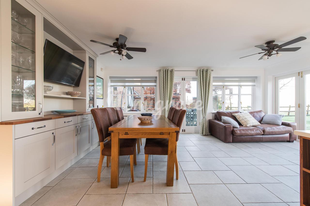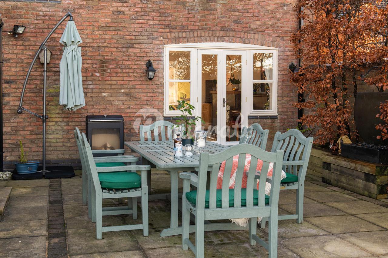 Боковой доступ к большому мощеному внутреннему дворику сзади, с неформальной лужайкой за его пределами с традиционным ограждением из столбов и перил и открытыми полями позади.