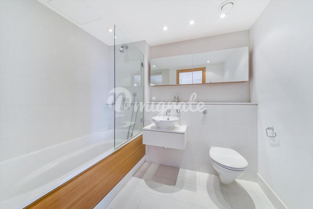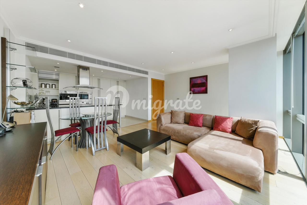 Предлагая 640 кв. Футов внутреннего пространства и обилие хорошего естественного света, апартаменты предлагают просторные комнаты и исключительный вид на Лондон, причем в каждой основной комнате есть окна от пола до потолка. Имущество включает в себя приемную открытой планировки с обеденной зоной, современную кухню со встроенной бытовой техникой, достаточно места для хранения и рабочей поверхности. Спальня выходит на южную сторону, со встроенными шкафами. В коридоре есть современная семейная ванная комната.