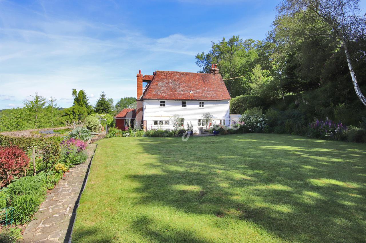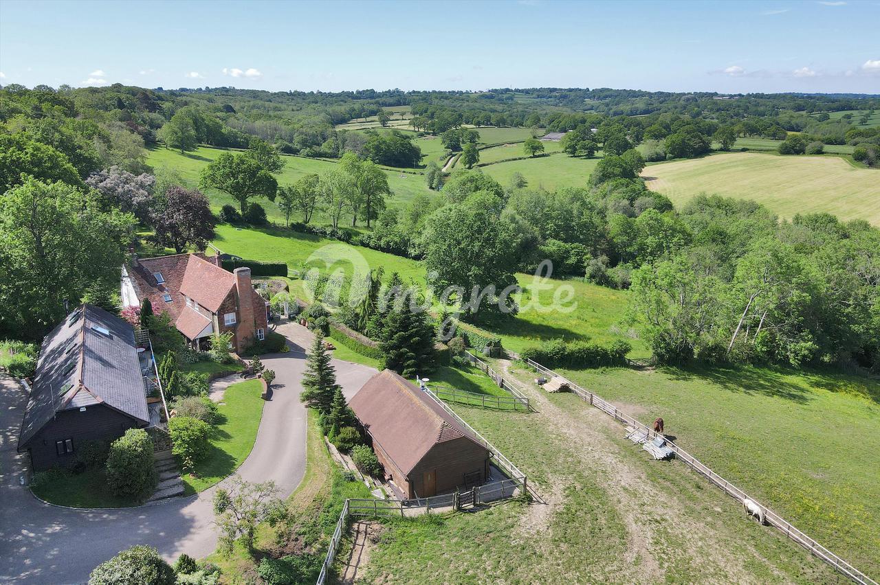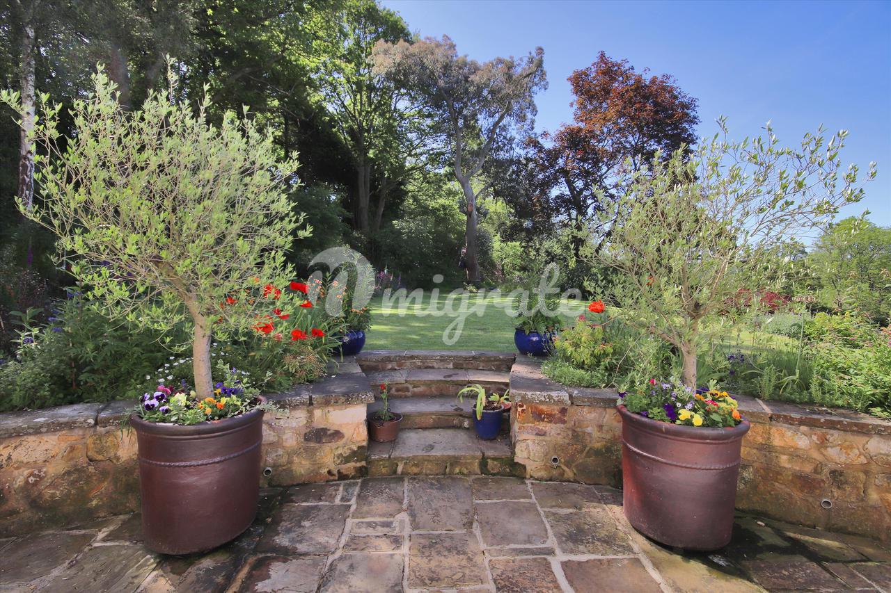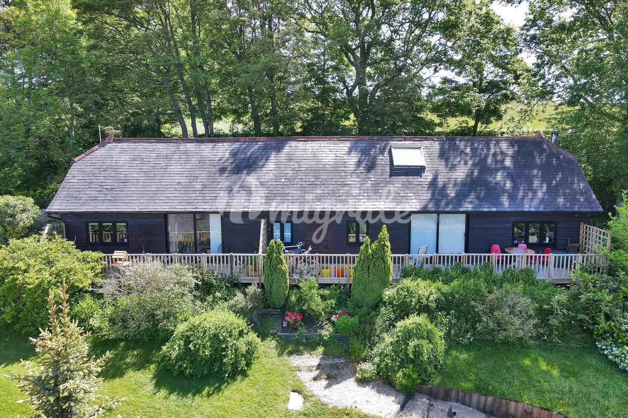 Снаружи к дому подходит конец длинной подъездной дороги, ведущей к парковке и отдельно стоящему гаражу на две машины с кладовой наверху, пристроенной кладовой и туалетом. Перед домом и сбоку от дома есть большая мощеная терраса, с которой открывается потрясающий вид. над собственными садами и территориями собственности и прилегающей сельской местностью.