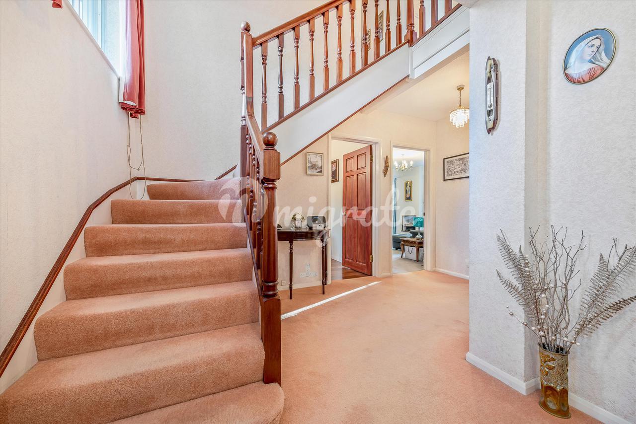 К этому семейному дому ведет посыпанная гравием подъездная дорожка с просторной гостевой парковкой перед домом и гаражом на две машины. Светлая и гостеприимная прихожая дает доступ ко всем основным помещениям для приемов, включая столовую и гостиную с дверями, выходящими во внутренний дворик и ухоженные сады. Кухня/комната для завтрака имеет широкий спектр настенных и напольных блоков, а также множество встроенных приборов и ведет в очаровательные сады в задней части дома. Семейная комната, которая ведет из кухни, имеет приятный вид и боковые двери, ведущие во внутренний дворик. Дополнительные помещения на первом этаже включают в себя кабинет, подсобное помещение, кладовую и гардеробную. Существует также доступ к пристройке, которая включает в себя кухню, уютную / гостиную, которую можно легко превратить в офис с видом на сад, ванную комнату и спальню. На первом этаже в главной спальне есть душевая и встроенные шкафы. Существует еще одна спальня с ванной комнатой, а также еще три спальни и семейная ванная комната. В задней части юго-западная сторона и частные сады в основном заложены газоном и имеют зрелые деревья и кустарники, граничащие с ограждением. К фронту собственность извлекает выгоду из вполне достаточной парковки и двойного гаража.