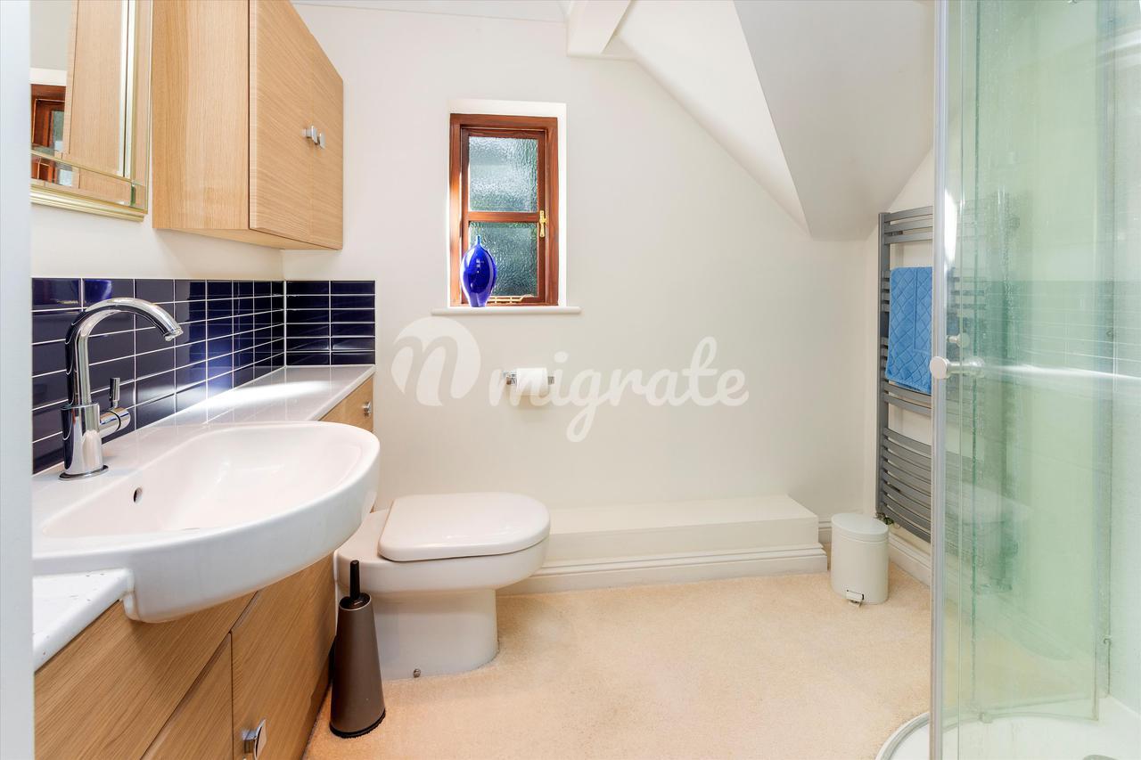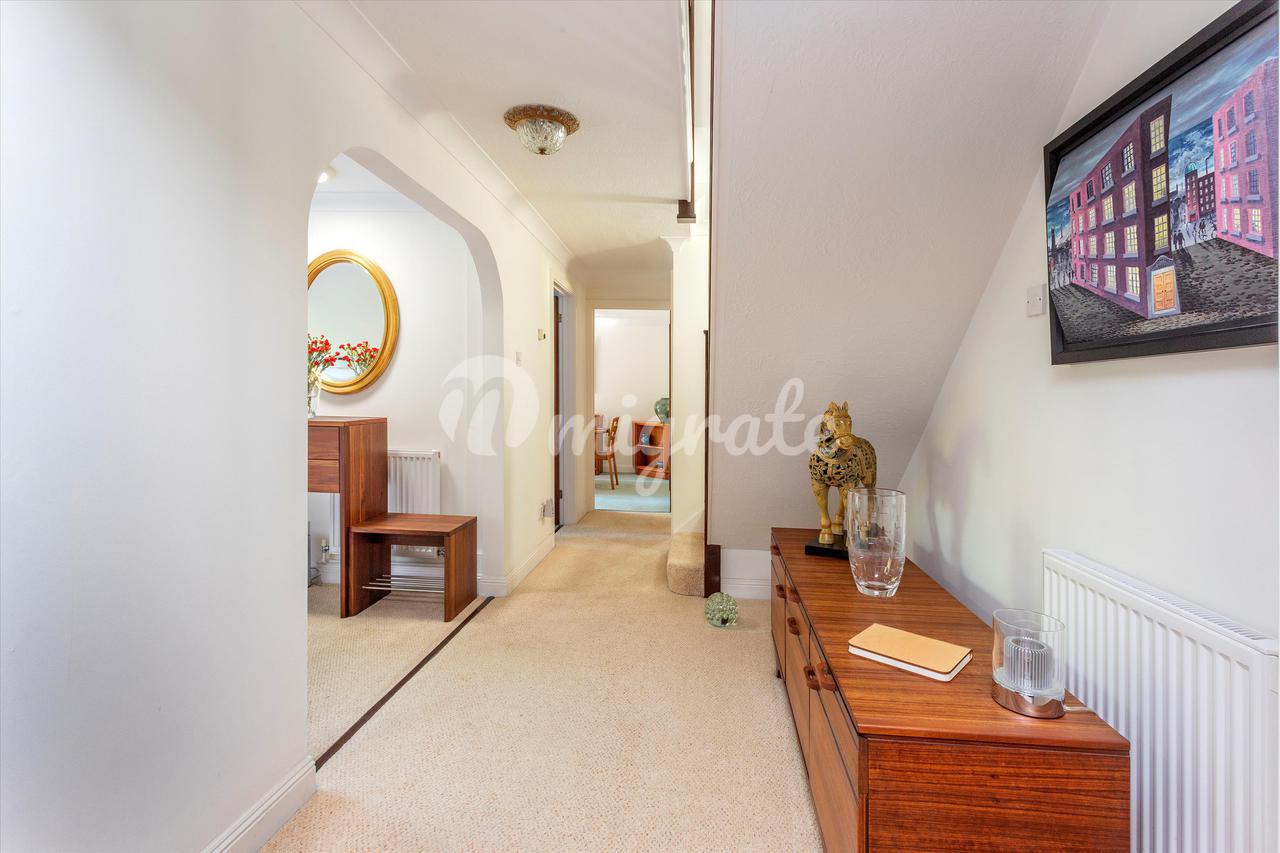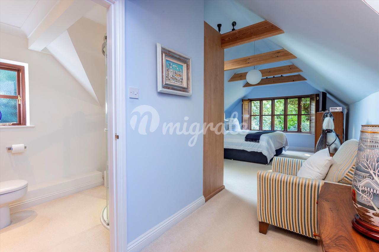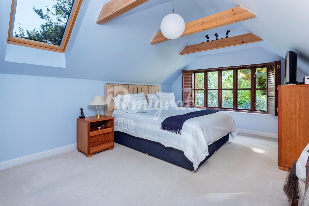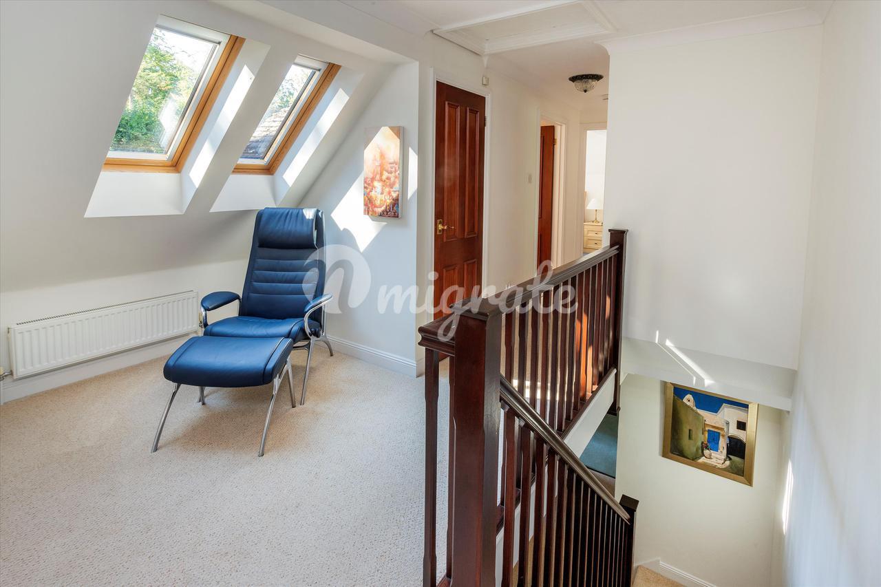 Вверх по лестнице находится большая главная спальня с открытым сводчатым потолком, откуда открывается вид на сад. Он содержит встроенные шкафы и ванную комнату с душем. Вторая спальня с ванной комнатой имеет вид на сад сзади и оснащена встроенными шкафами, а также собственной душевой кабиной. Есть еще три спальни, две из которых двухместные, со встроенными шкафами, а также семейная ванная комната, завершающая планировку первого этажа.