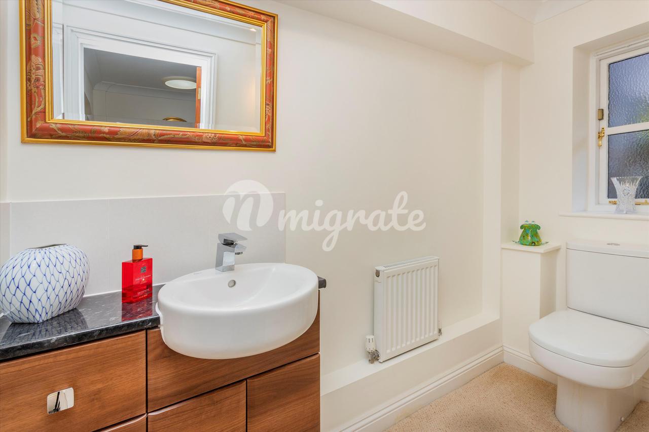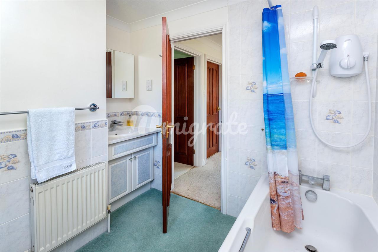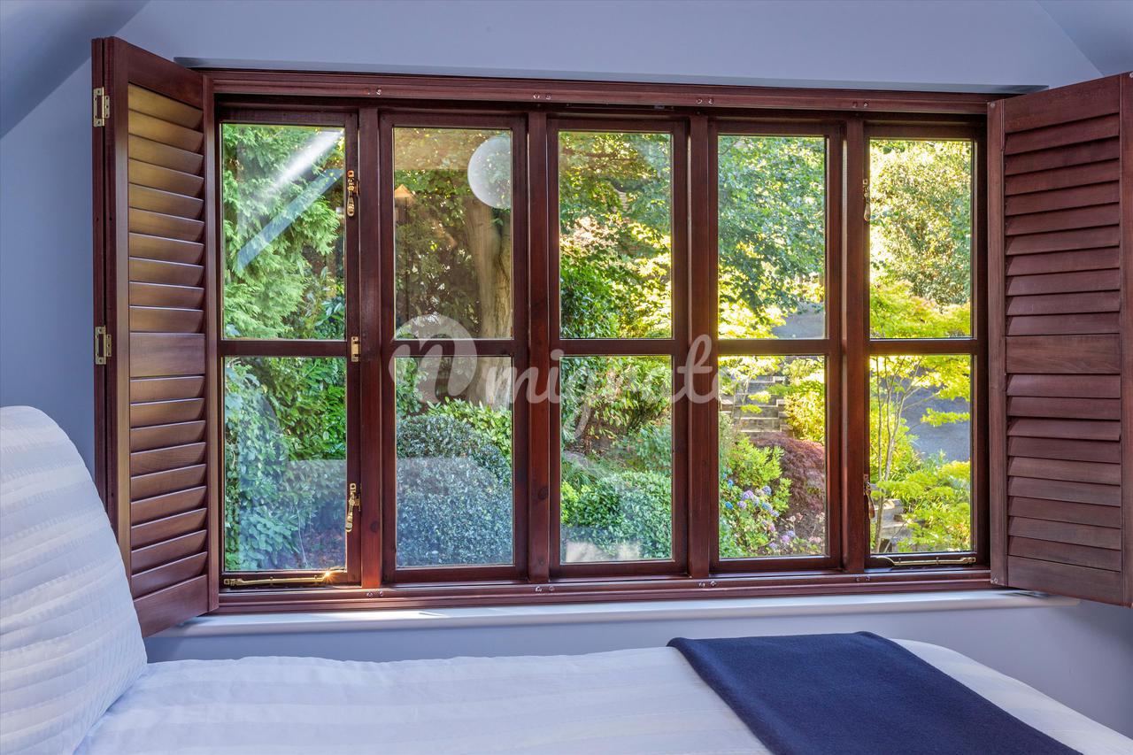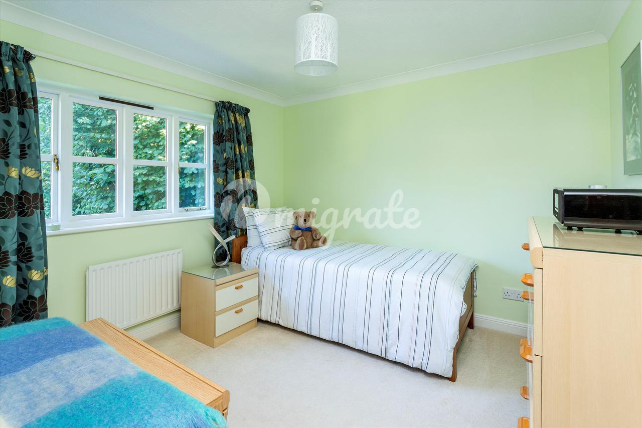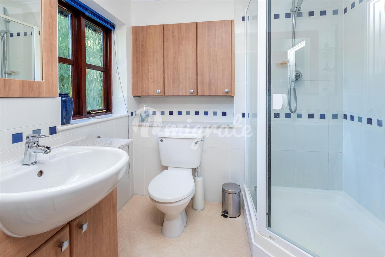 Вверх по лестнице находится большая главная спальня с открытым сводчатым потолком, откуда открывается вид на сад. Он содержит встроенные шкафы и ванную комнату с душем. Вторая спальня с ванной комнатой имеет вид на сад сзади и оснащена встроенными шкафами, а также собственной душевой кабиной. Есть еще три спальни, две из которых двухместные, со встроенными шкафами, а также семейная ванная комната, завершающая планировку первого этажа.
